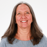 A smiling woman with long gray hair in a gray top poses against a white background, embodying the compassionate spirit of digital healthcare and medbridge innovations.