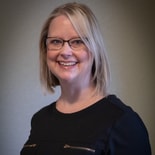 Blonde woman with glasses smiling against a gray background in medbridge.
