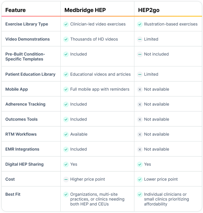 Side-by-Side Comparison Chart: Medbridge vs HEP2go