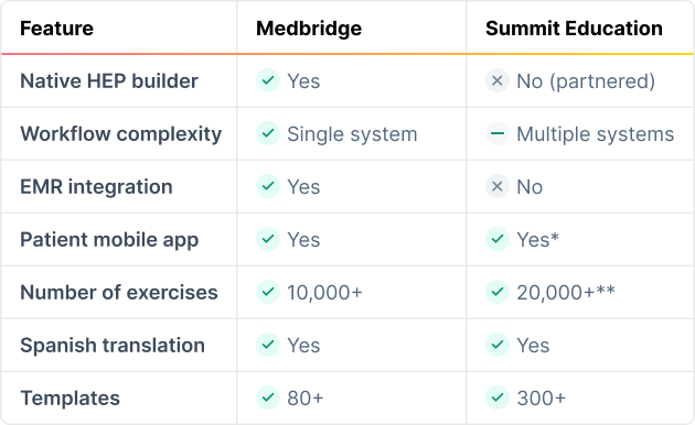 Medbridge pricing might appear higher at first glance, but that difference narrows when considering what is included. Medbridge’s Premium subscription includes access to its HEP tools, whereas Summit Education charges an additional $9.99 per month for optional HEP access. This equals $439.99 per person per year for an All Access plan plus HEP. For clinicians who regularly use both continuing education and HEP functionality, having these tools bundled into a single subscription can simplify workflows and reduce total monthly costs compared with paying separately for education and exercise programming.