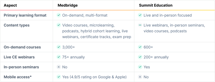 Summit Education emphasizes live and in-person CE experiences, with a smaller on-demand library and a more traditional learning structure.