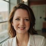 A person with shoulder-length hair and a white shirt smiles warmly in an indoor setting, reflecting Medbridge's compassionate healthcare values.