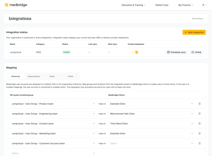 Medbridge’s User Management Integration page.
