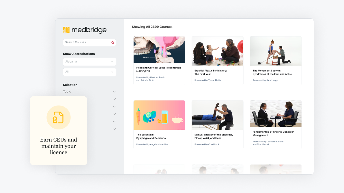 Medbridge courses are accredited for physical therapists, physical therapy assistants, occupational therapists, occupational therapy assistants, certified athletic trainers, strength and conditioning specialists, speech-language pathologists, nurses, case managers, long-term care administrators, respiratory therapists, social workers, and more. You can find specific accreditation information in the course listings.